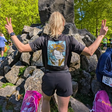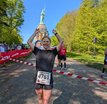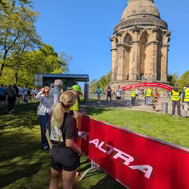Mit dem Shuttlebus ging’s von Bielefeld zum Startpunkt am Hermannsdenkmal in Detmold – einer Kulisse, die mindestens so episch ist wie der Lauf selbst. Strahlender Sonnenschein, blitzblauer Himmel – kurz: das Wetter meinte es gut. Nur die Dixischlangen waren wieder ein Wettkampf für sich.